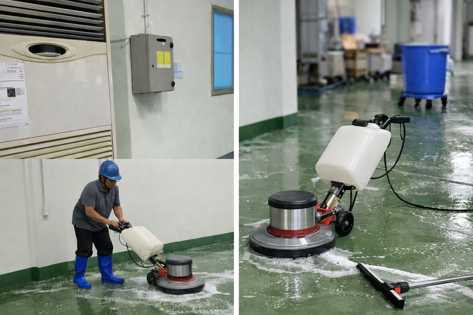 Đội ngũ nhân viên sử dụng máy móc chuyên dụng để làm sạch toàn bộ nhà xưởng.