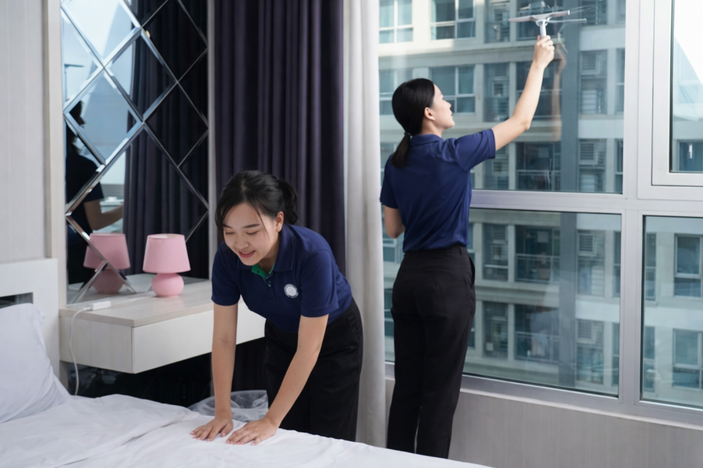 Nhân viên đến đúng giờ và thực hiện công việc theo quy trình vệ sinh tiêu chuẩn.